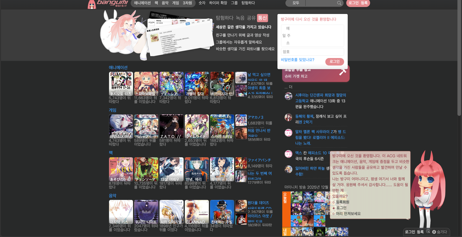 애니메이션, 만화, 게임, 책, 음악 등 오타쿠 문화 콘텐츠를 중심으로 한 중국 기반의 커뮤니티 및 데이터베이스 사이트입니다. 사용자가 작품을 검색, 평가, 리뷰하며 일정을 추적할 수 있도록 설계되었으며, 매일 방송 시간표와 태그 기반 탐색 기능을 제공합니다.